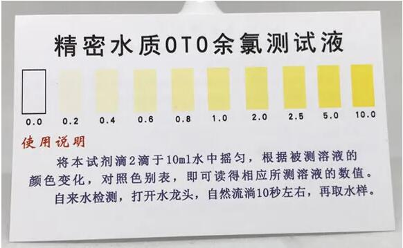 在待测水中加入邻联甲苯胺,余氯会与邻联甲苯胺发生反应,生成黄色的醌(kūn)式化合物,使得待测水样变成黄色。颜色越黄表示水中余氯的浓度越高。通过比色卡目视即可得到水中余氯的大小。